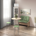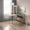 Набор мебели для кухни, включающий в себя: одну прямую скамью, два табурета и круглый стол на металлических ногах. В прямой скамье под сиденьем расположен ящик. Каркас скамейки - ЛДСП. Стол "Лотос": ножки - окрас "серебро", столешница "Термопластик", 24 мм.
