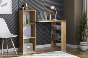 Компактный компьютерный стол со столешницей размером 822х493 мм. С одной стороны столешница опирается на открытый стеллаж размером 150х734х460 мм с двумя полками. С другой стороны столешница пристыковывается к открытому пеналу размером 328х1026х296 мм также с двумя полками. Стол можно собрать на любую сторону. Максимально допустимая нагрузка на столешницу — 15 кг, на полки — 5 кг.